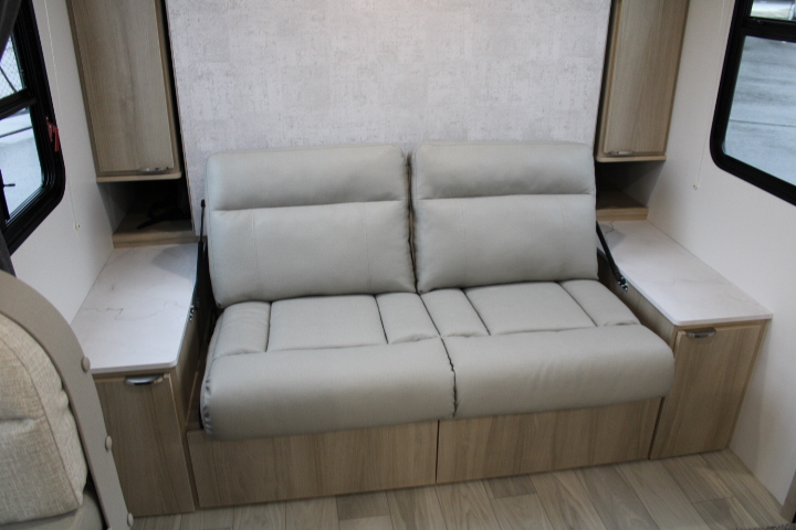 At just 7 feet wide, this compact travel trailer, has a floorplan that includes a front Murphy bed, a dinette in a slide-out, an open galley, and a large rear bathroom. It’s designed to be easy to tow and turn, and promotes spaciousness within its compact size.